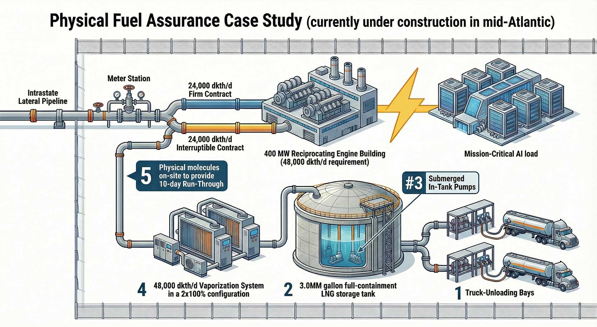 On-site LNG storage replaces contractual assurance with physical assurance: molecules on site, inside the fence, and available on demand.